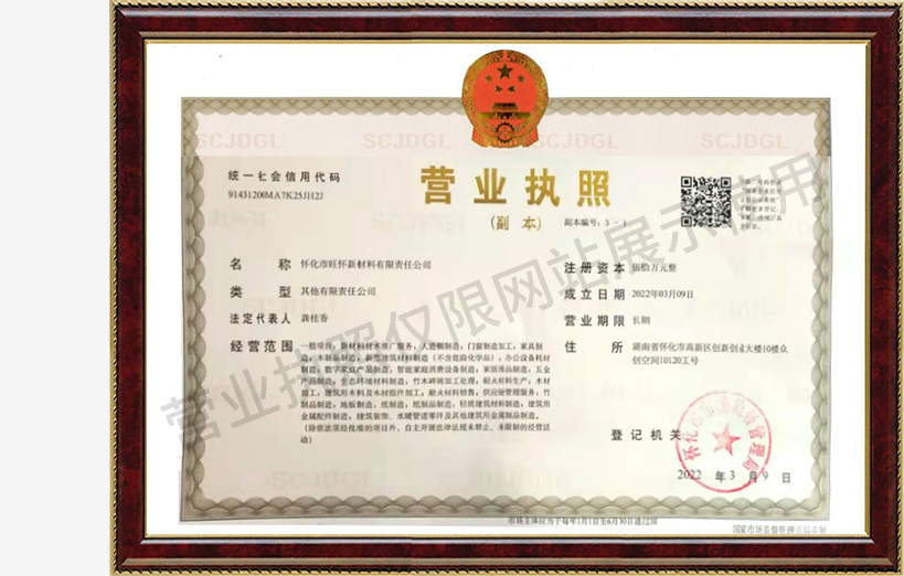 懷化市旺懷新材料有限責(zé)任公司是一家集新材料技術(shù)推廣和板材家居制造的新型企業(yè)。公司注冊(cè)資金50萬(wàn)元,現(xiàn)有員工近100人,位于懷化市國(guó)家高新區(qū)工業(yè)園。